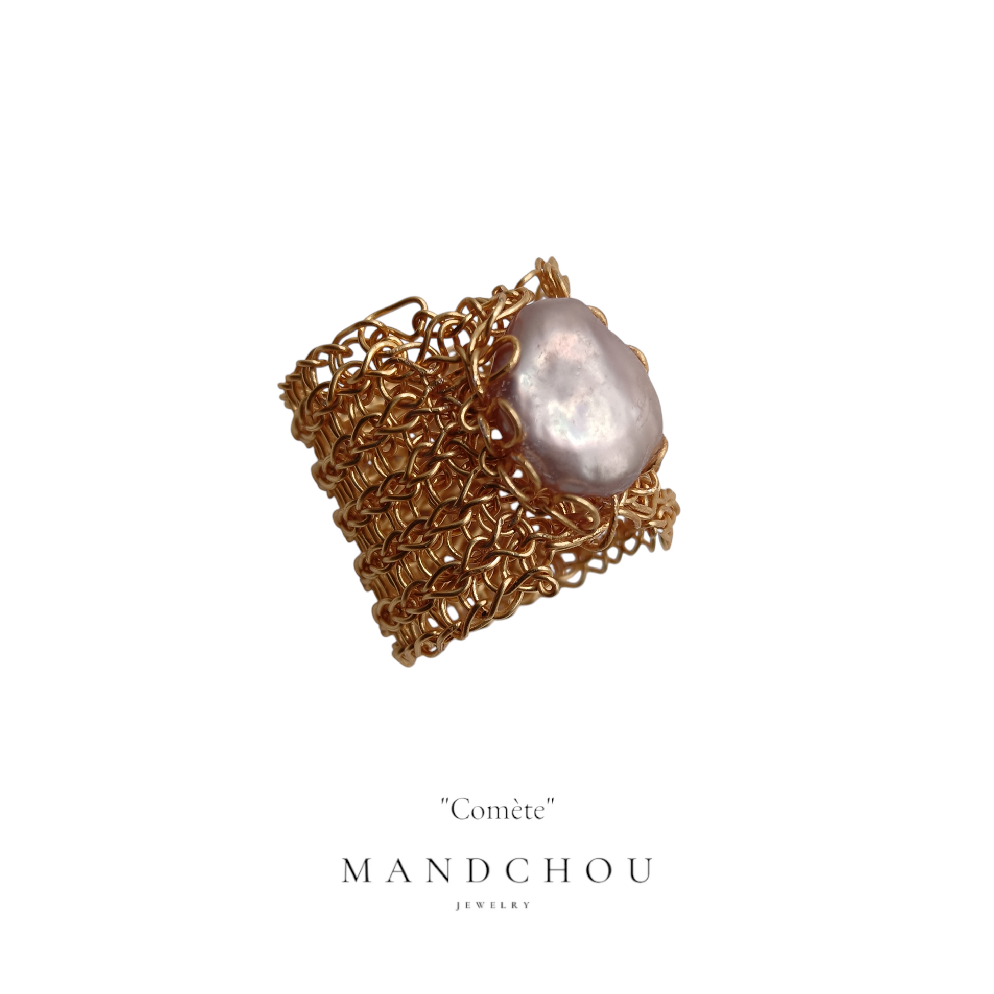 Découvrez la bague "Comète", une pièce maîtresse de notre collection signature "couture". Élaborée avec un soin exquis, cette bague est confectionnée en fil d'or plaqué 18 carats, à la fois somptueuse et contemporaine. Au centre de cette création, une perle fine de rivière, délicatement rosée, se déploie, apportant une élégance subtile et un raffinement intemporel.