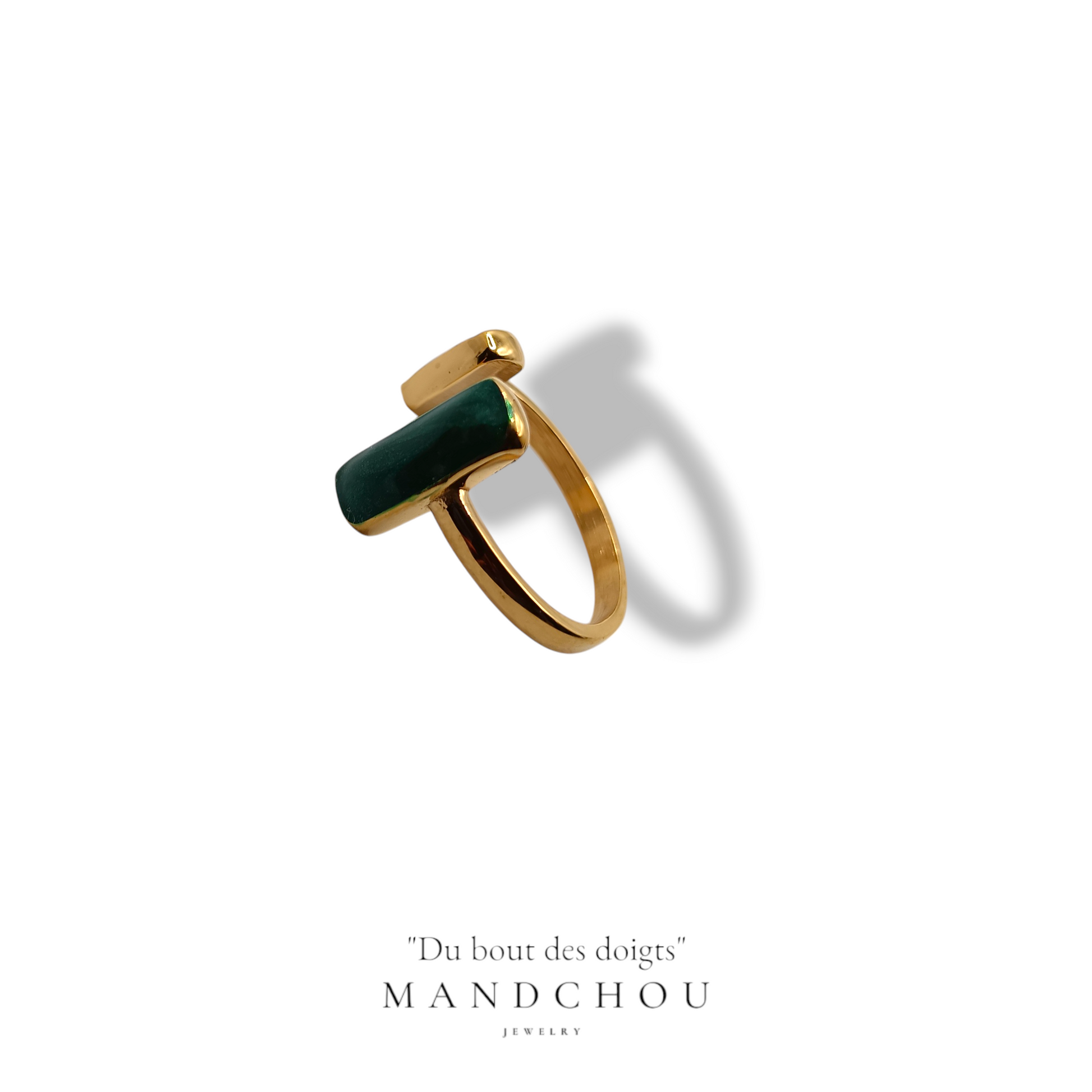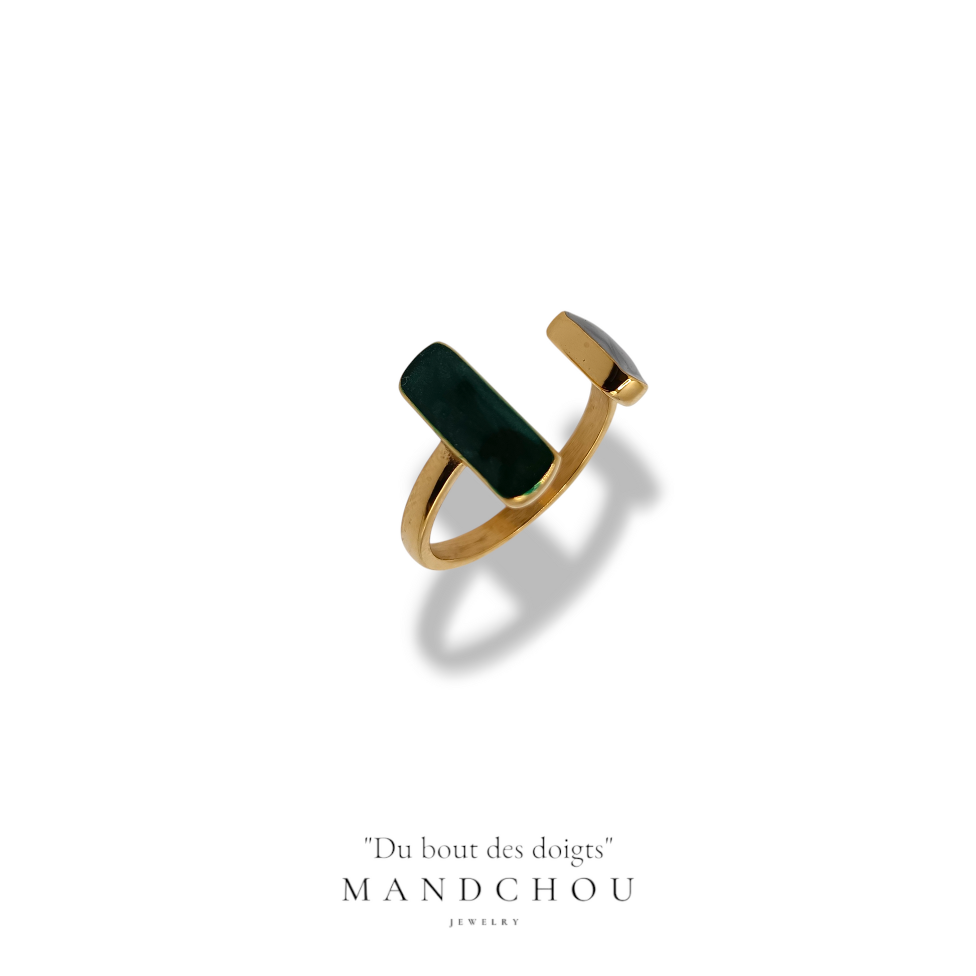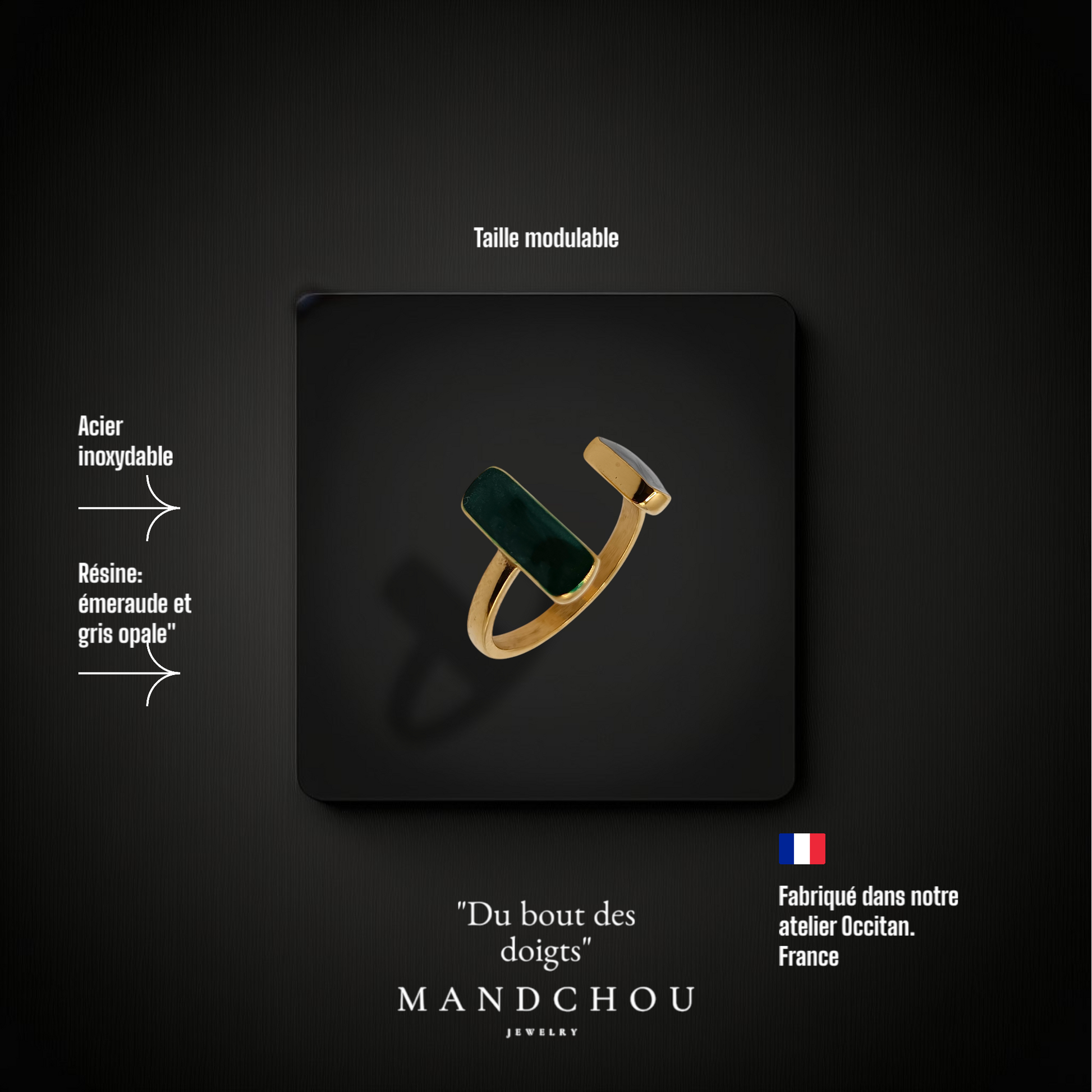 Discrete, chic et couture pour cette bague indispensable dans vos fantaisie. En acier inoxydable, résiné émeraude vert et gris intemporel. Son jonc modulable lui permet de s'adapter à tous les doigts.