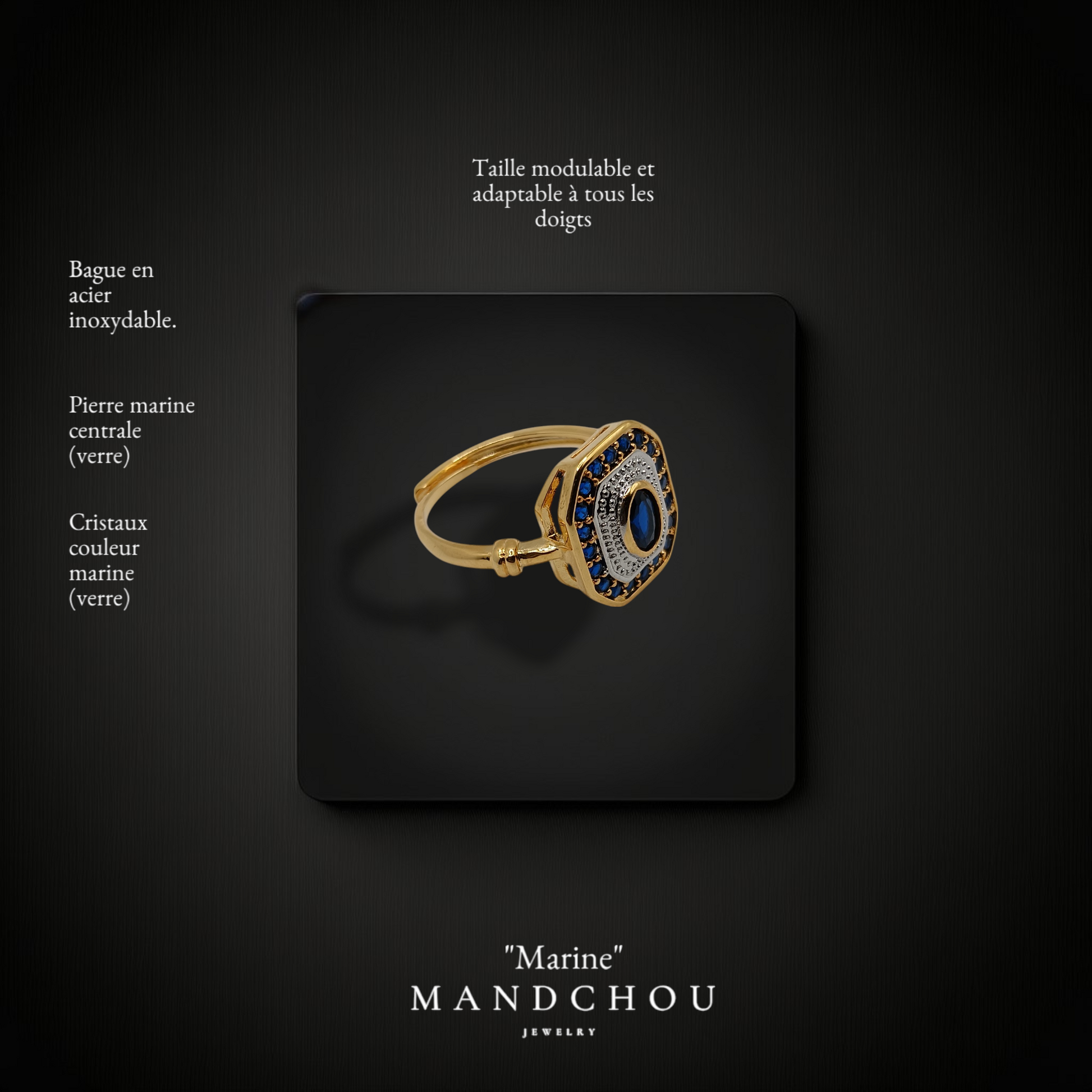 Marine est une bague fantaisie délicate raffinée. Sa pierre centrale d'un bleu marine avec ses cristaux de la même couleur offre un caractère a cette jolie fantaisie disponible à un prix tres accessible.