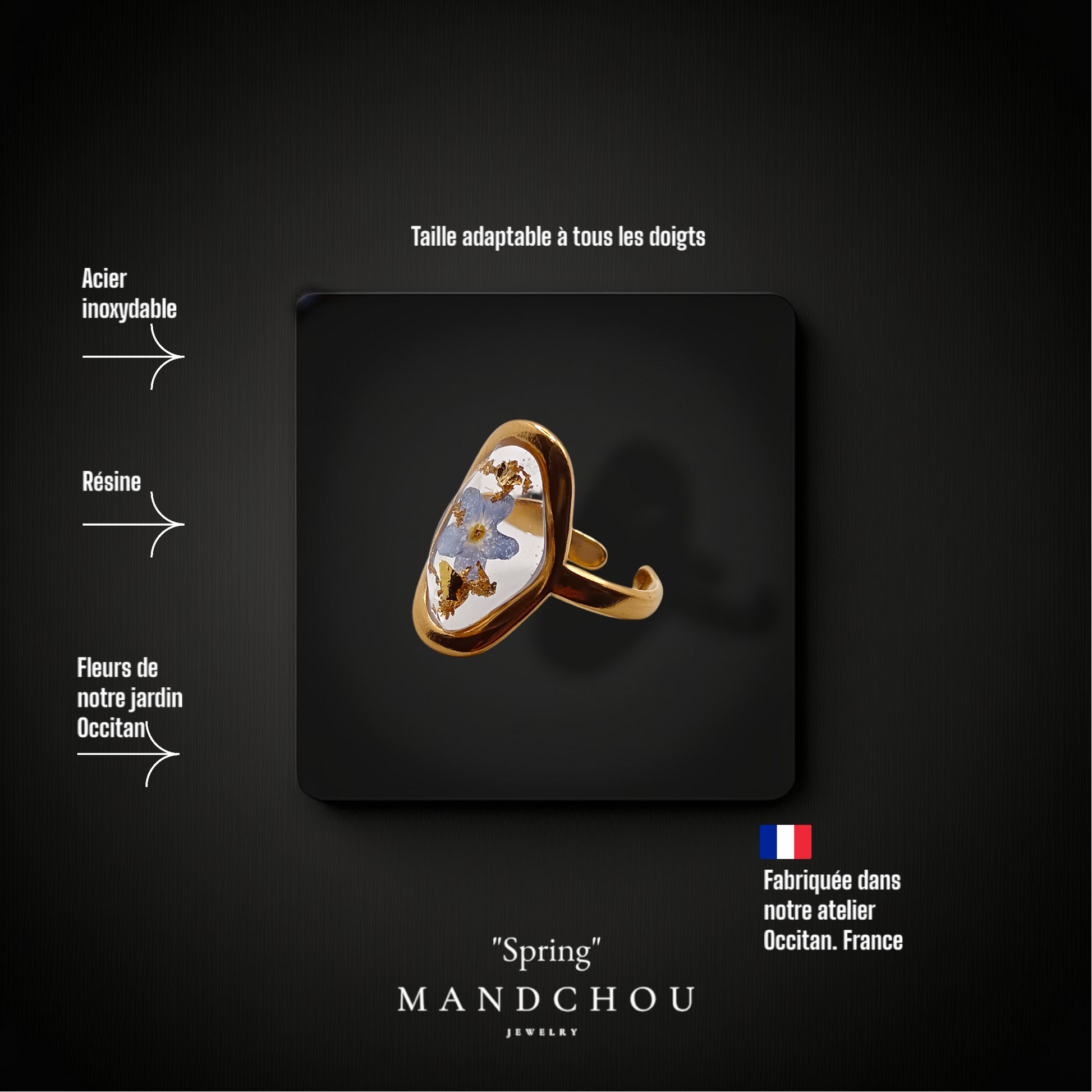 Une bague exclusive, fabriquée dans notre atelier Occitan. Nous avons choisi nos plus belles fleurs de notre jardin, myosotis fleurs de printemps d'un bleu pur, immortalisées dans une résine transparente. En acier inoxydable pour une durabilité excellente. Des feuilles d'or pour ajouter à la préciosité.
