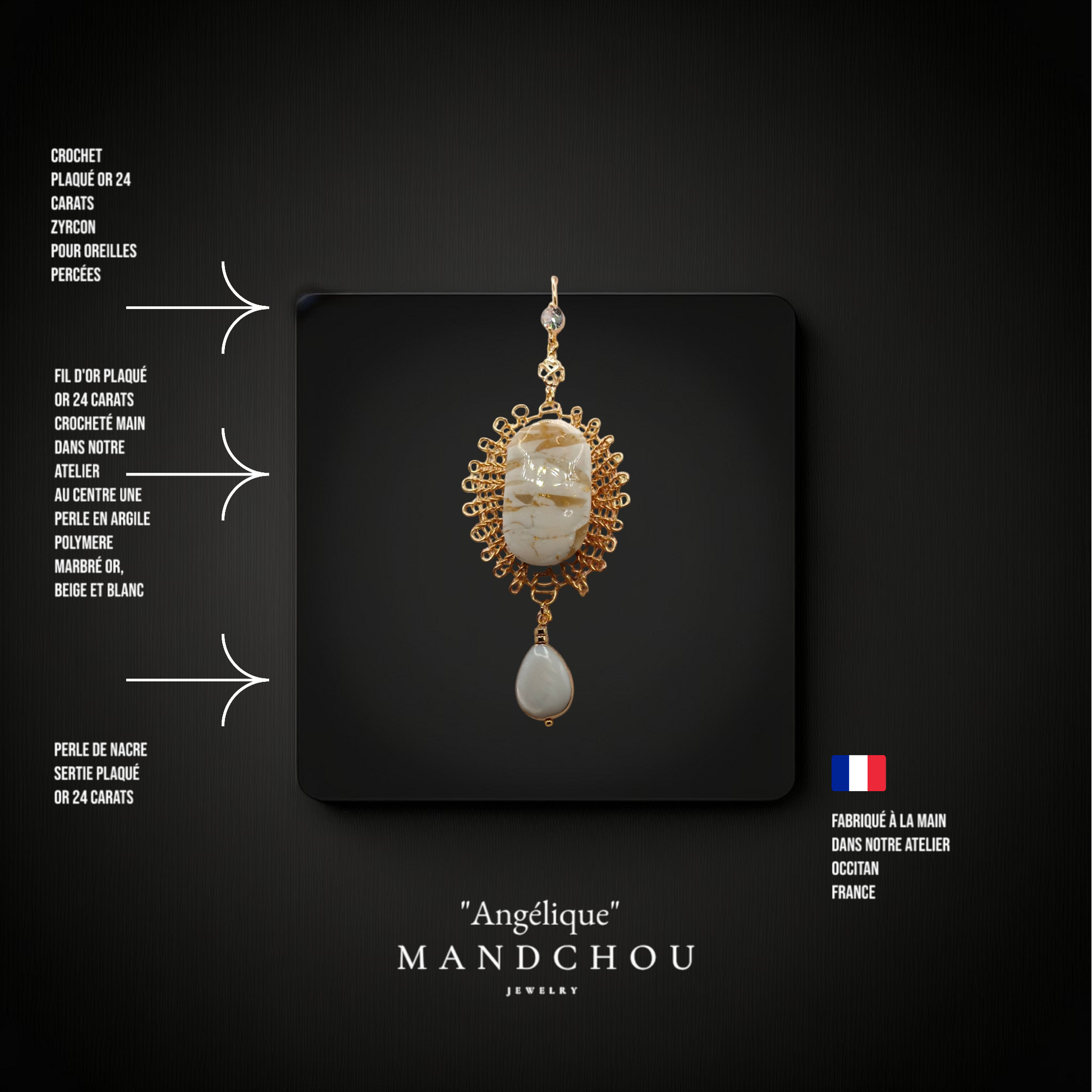 Au cœur de chaque paire, vous trouverez une pièce en argile “fimo” marbrée, mélange exquis de blanc et d'or, qui attire le regard et évoque l'artisanat d'art. Ce détail élégant est sublimé par la finition avec une perle de nacre plaquée or 24 carats, ajoutant une touche ultime de luxe à votre collection de bijoux.