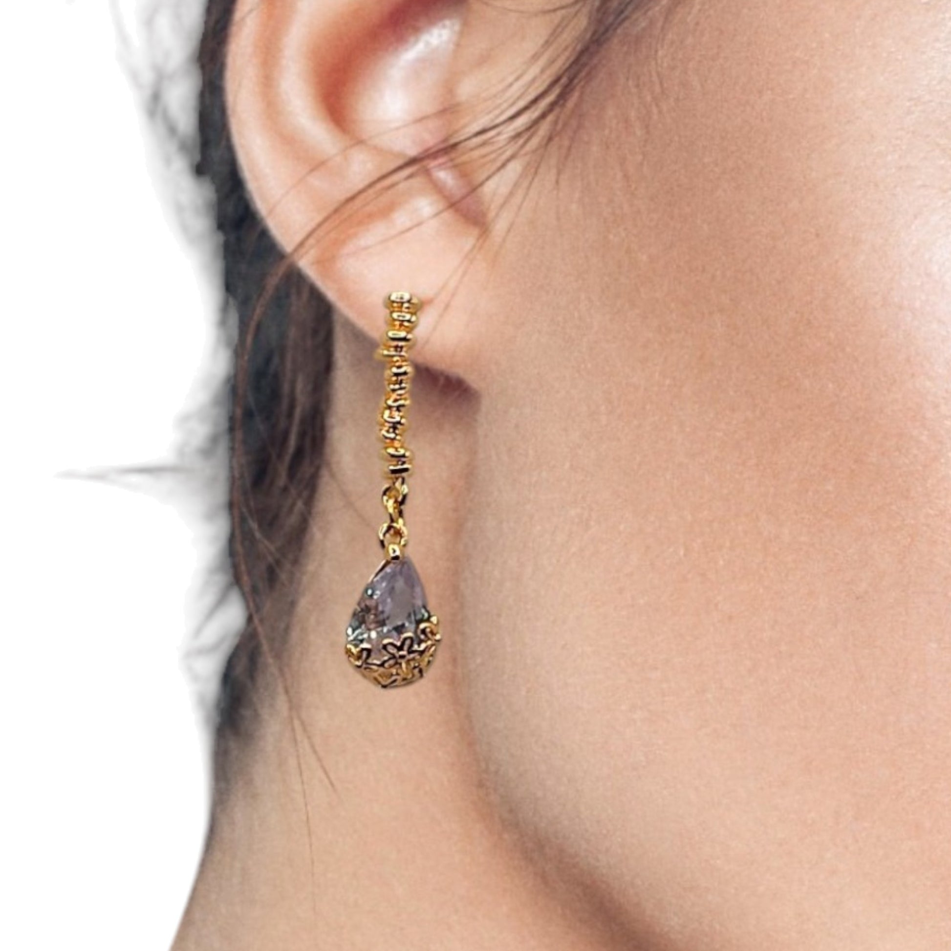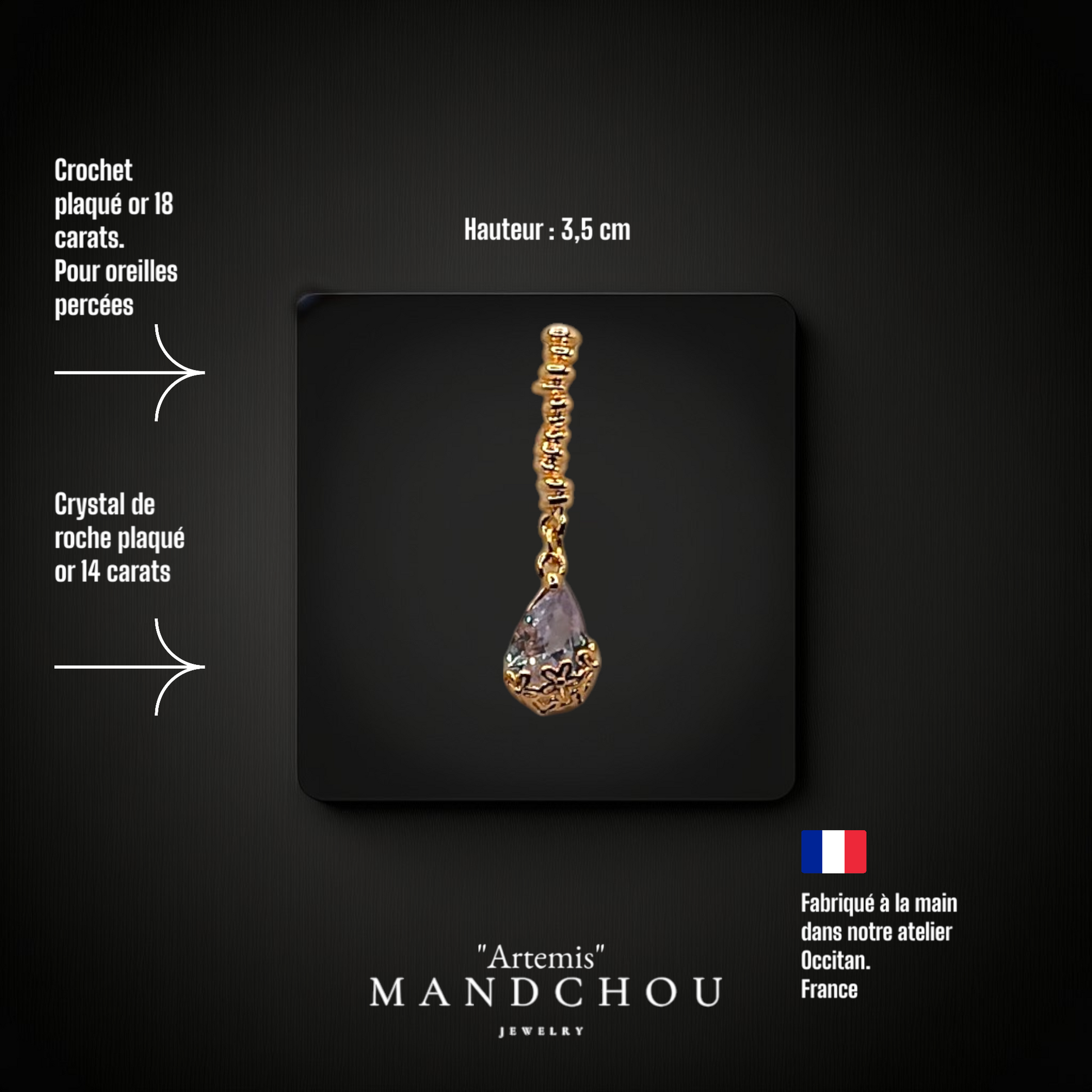 Chaque création est ornée d'un cristal de roche pur, délicatement façonné en forme de goutte, capturant la lumière d'une manière fascinante. Le plaquage en or 18 carats ajoute une touche de luxe, garantissant que chaque mouvement évoque un scintillement subtil qui attire tous les regards.