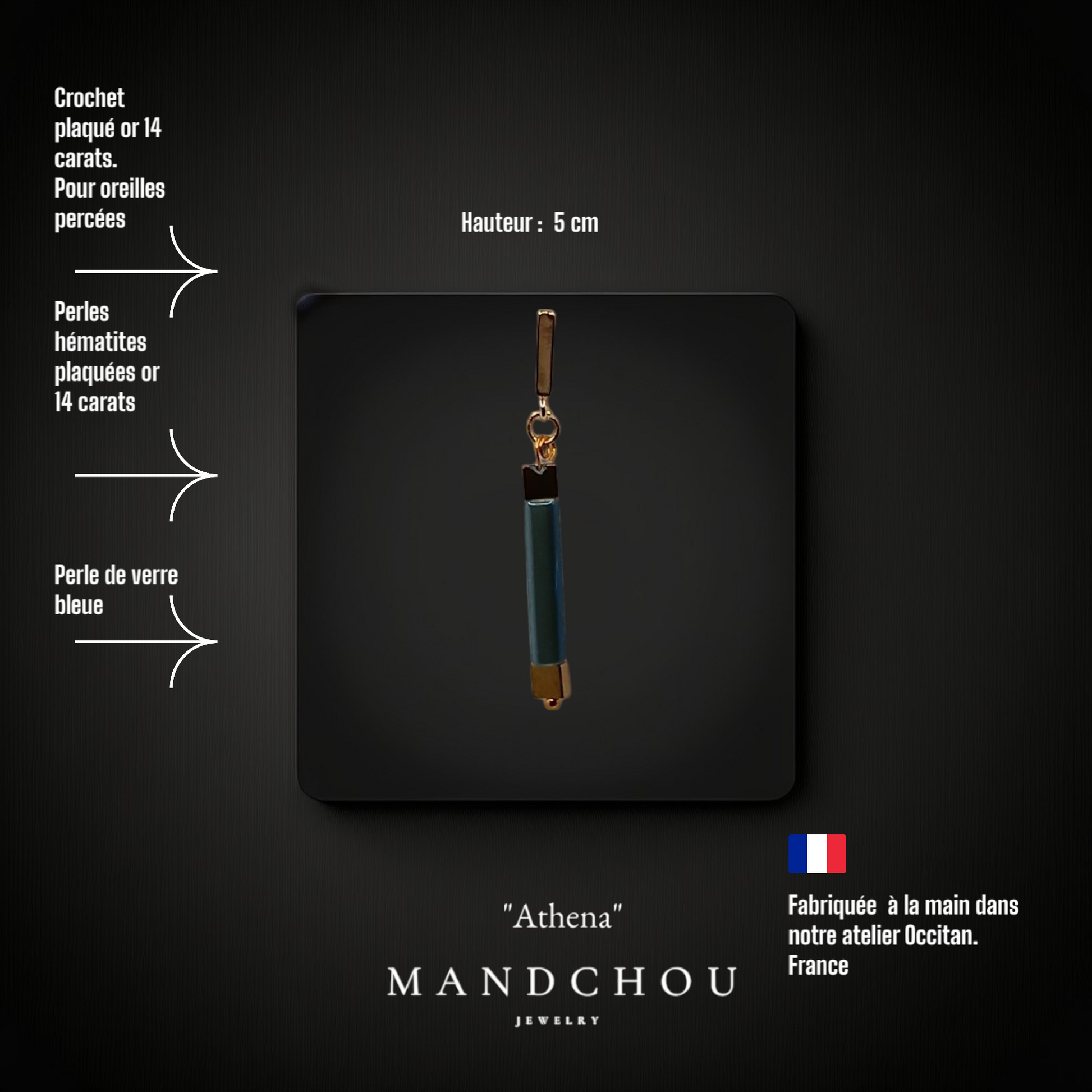 Leurs ornements de perles d'hématites, profondément inspirées par le luxe intemporel, sont délicatement associés à des perles de verre bleu azur, évoquant la sérénité d'une fin d'après-midi estivale. Chaque détail a été pensé pour rendre ces boucles d'oreilles irrésistibles : leur légèreté permet un port confortable tout au long de la journée, tandis que leur design élégant attire tous les regards sans être ostentatoire. Que vous les choisissiez pour une occasion spéciale ou pour rehausser votre tenue quotidienne, les boucles d'oreilles "Athena" sont le choix idéal pour celles qui chérissent la finesse et l'originalité.