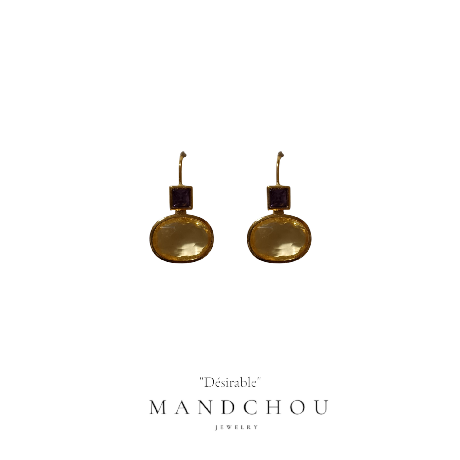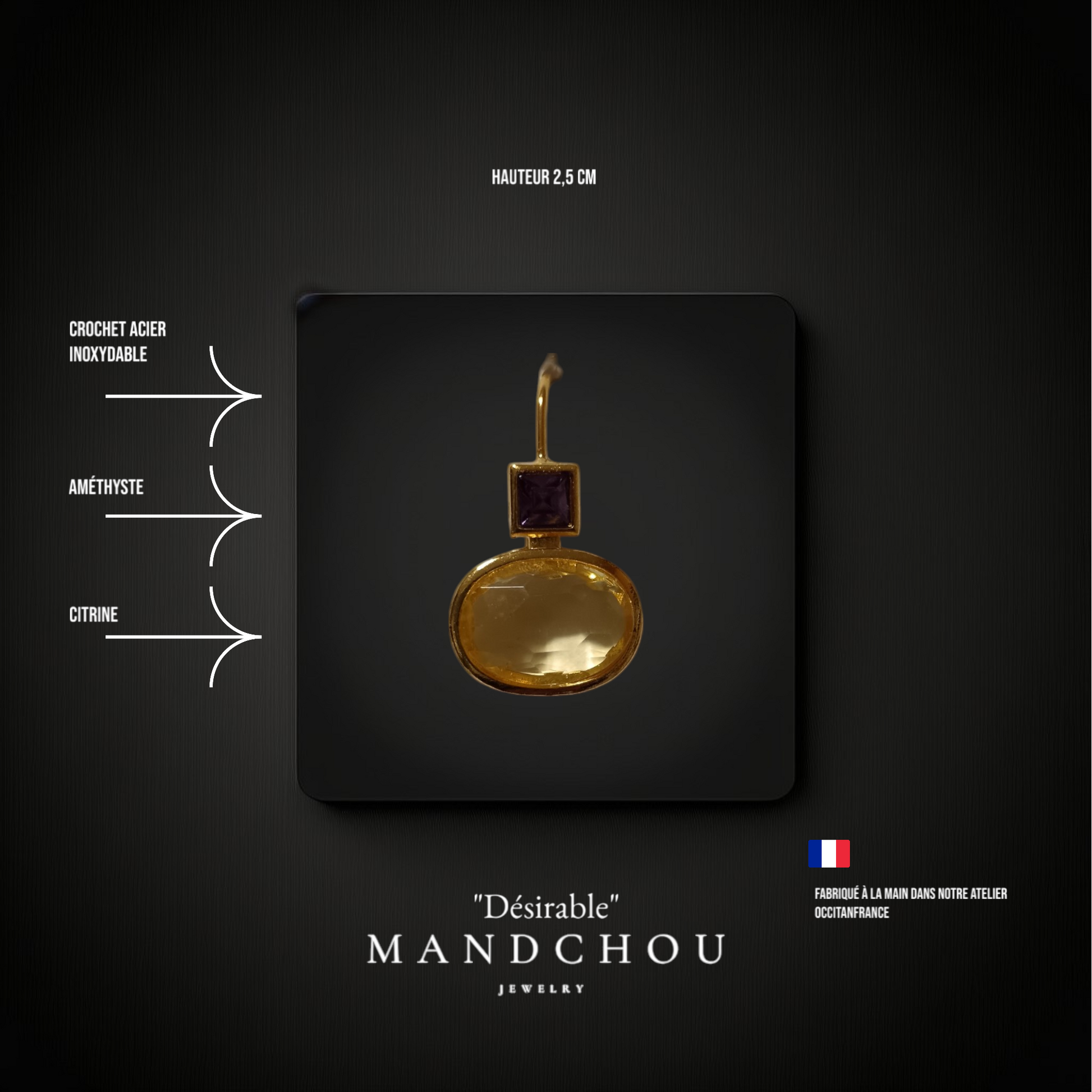 Chaque paire est ornée de magnifiques pierres de citrine et d'améthyste, délicatement agencées pour créer une harmonie visuelle captivante. La simplicité de leur design met en avant la quintessence de la beauté naturelle des pierres, faisant de ces boucles d'oreilles un accessoire versatile qui s'adapte à toutes les occasions, que ce soit pour un événement formel ou une soirée décontractée.