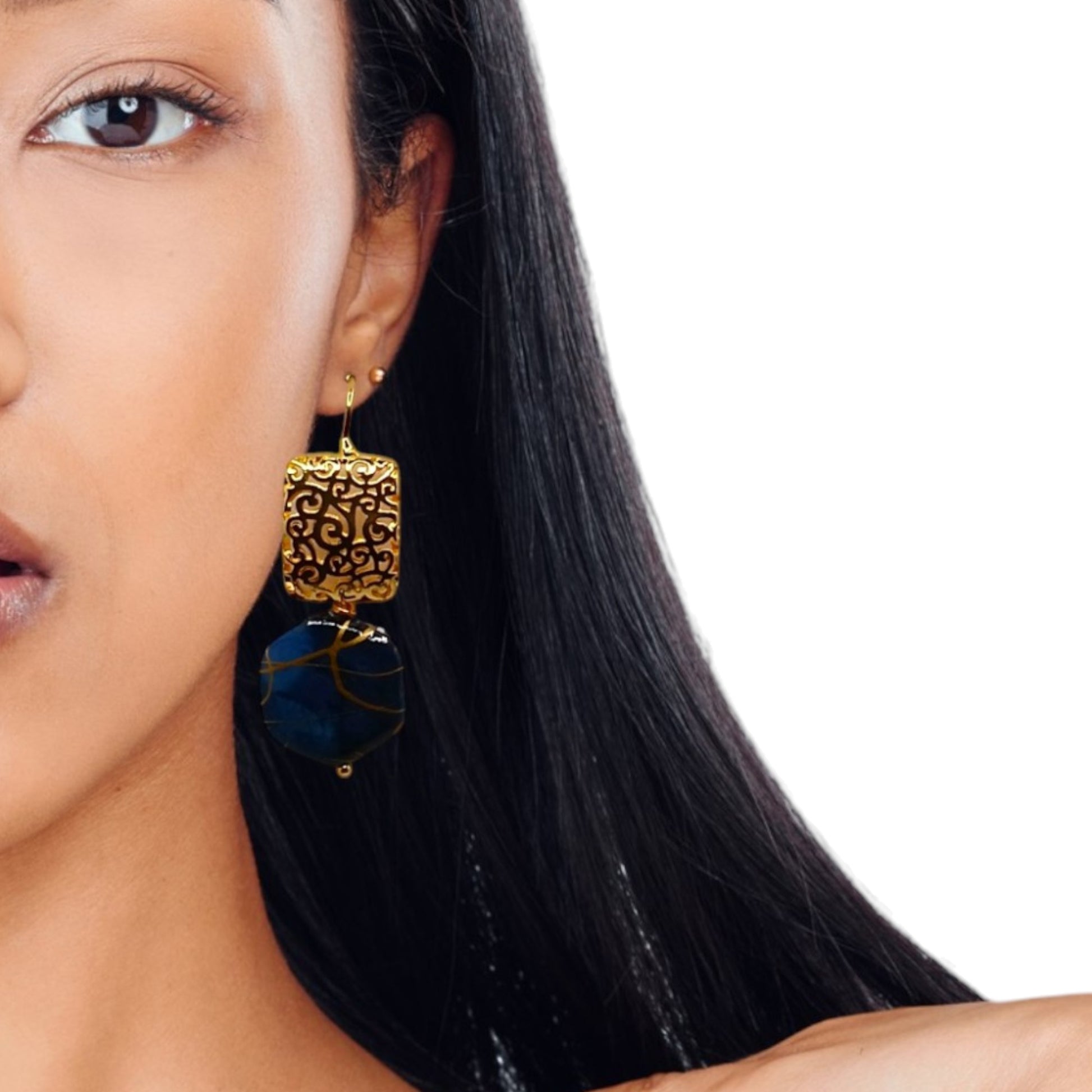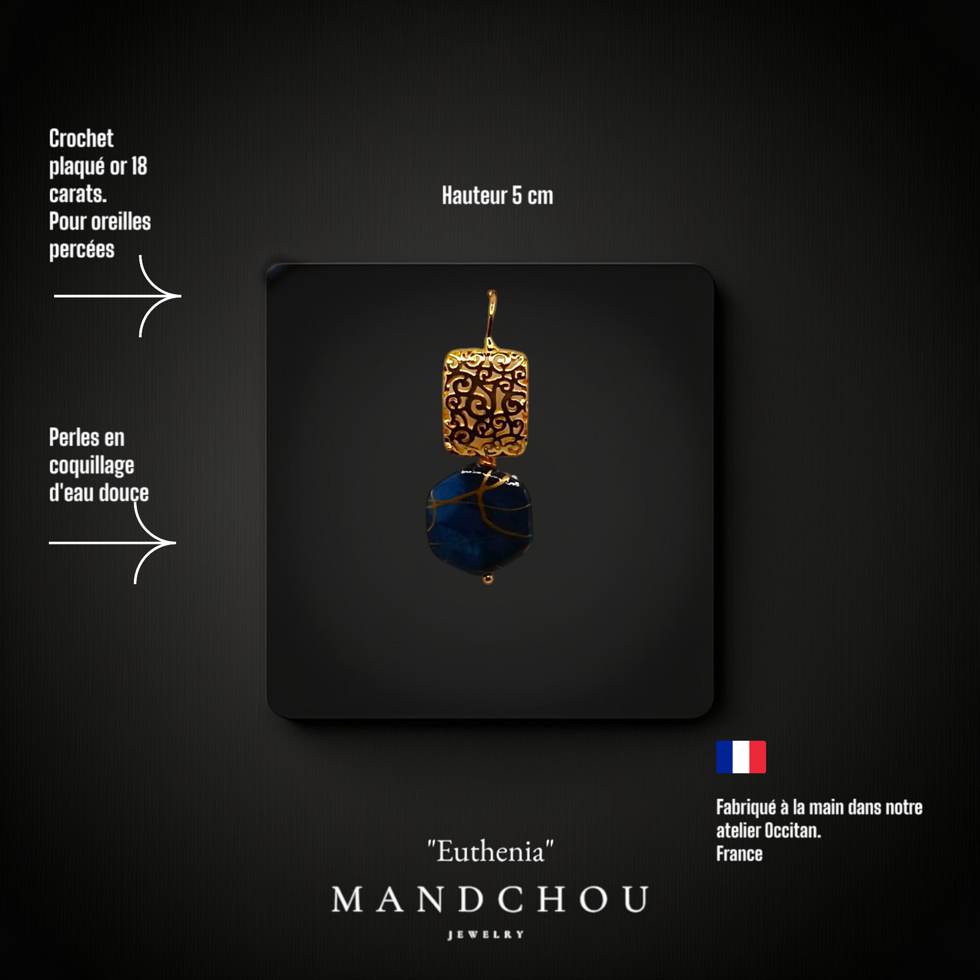 Élégantes et raffinées, ces boucles d'oreilles bleues nuit profond rehaussées d'un fil d'or sont confectionnées à partir de coquillages d'eau douce, offrant un éclat unique qui saura charmer toutes les femmes, de jour comme de nuit.