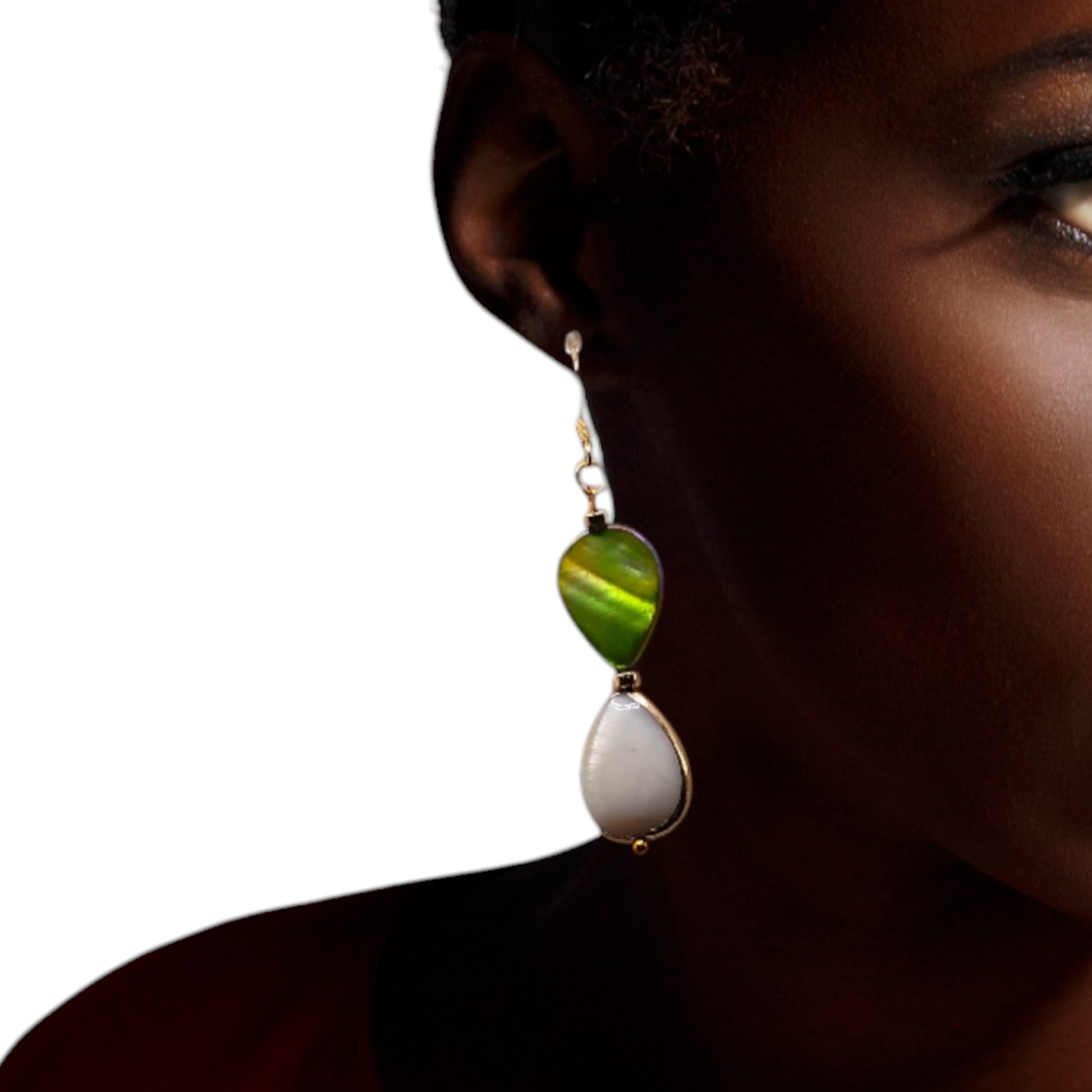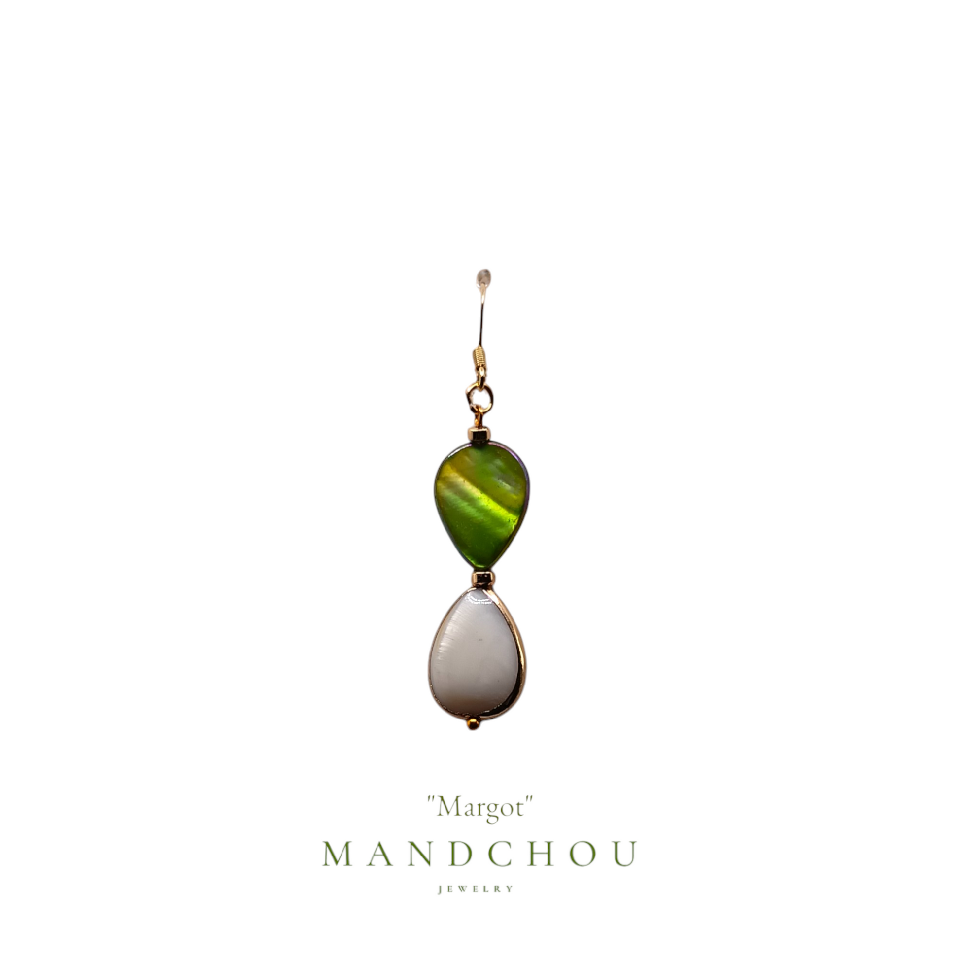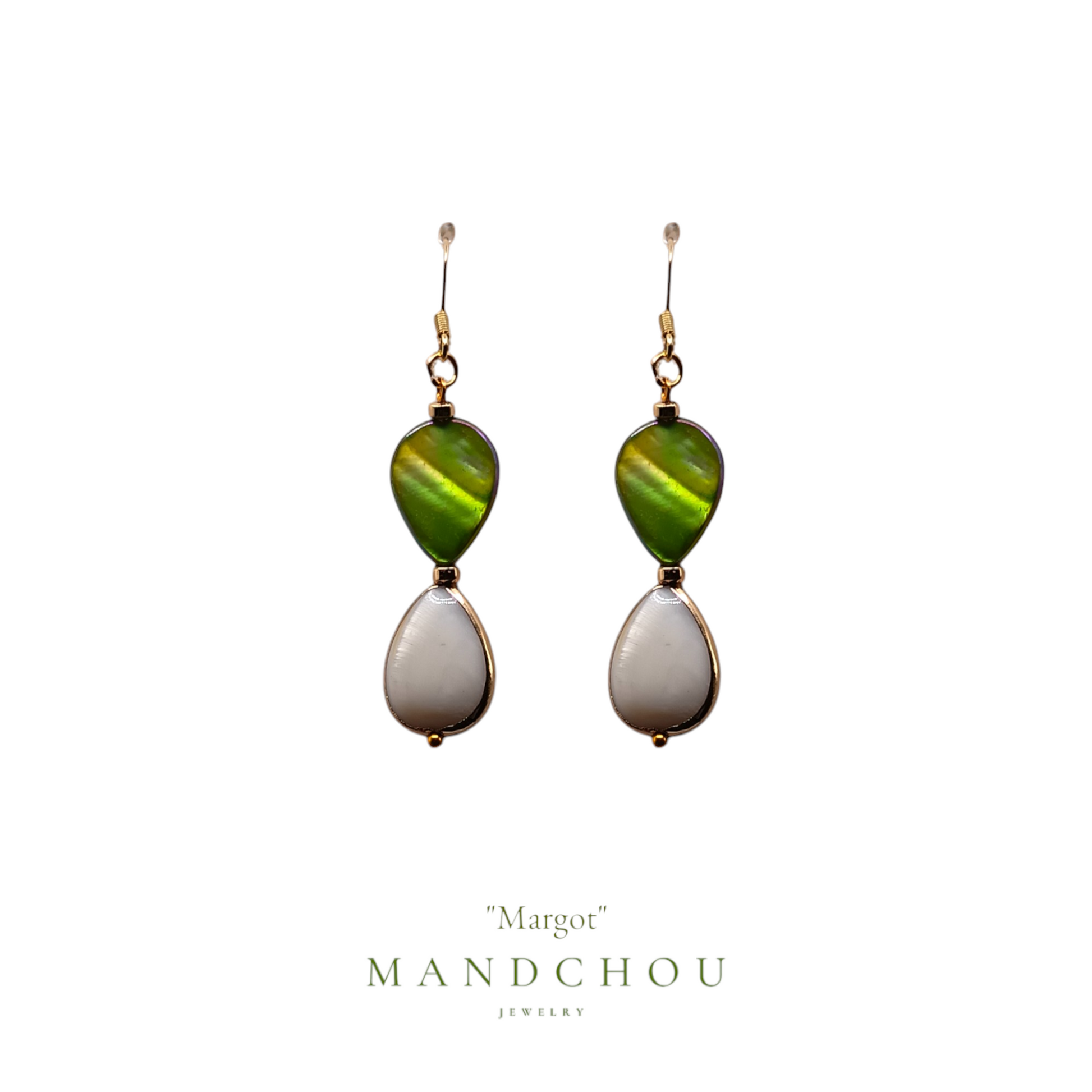 Conçues pour sublimer votre style, ces boucles d'oreilles sont élégamment ornées de deux perles de nacre, verte et blanche qui capturent la lumière avec grâce.