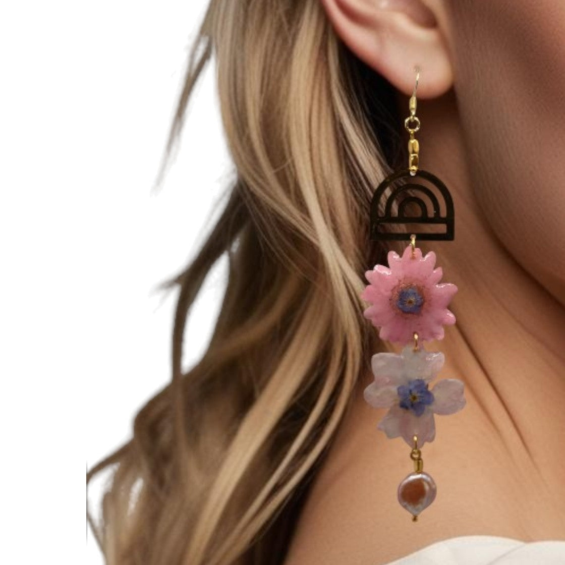 Ces boucles d'oreilles uniques sont ornées de fleurs de cerisiers délicates, de marguerites pourpres vibrantes et de myosotis, tous immortalisés dans une résine claire qui préserve leur beauté éphémère. Le jeu de couleurs et de textures évoque les doux jours d'été, où les champs sont parés de fleurs éclatantes et où les soirées se prolongent sous un ciel étoilé. Pour ajouter une touche d'élégance supplémentaire, chaque boucle se termine par une jolie perle de rivière, qui capte la lumière et apporte une brillance subtile à votre attire.