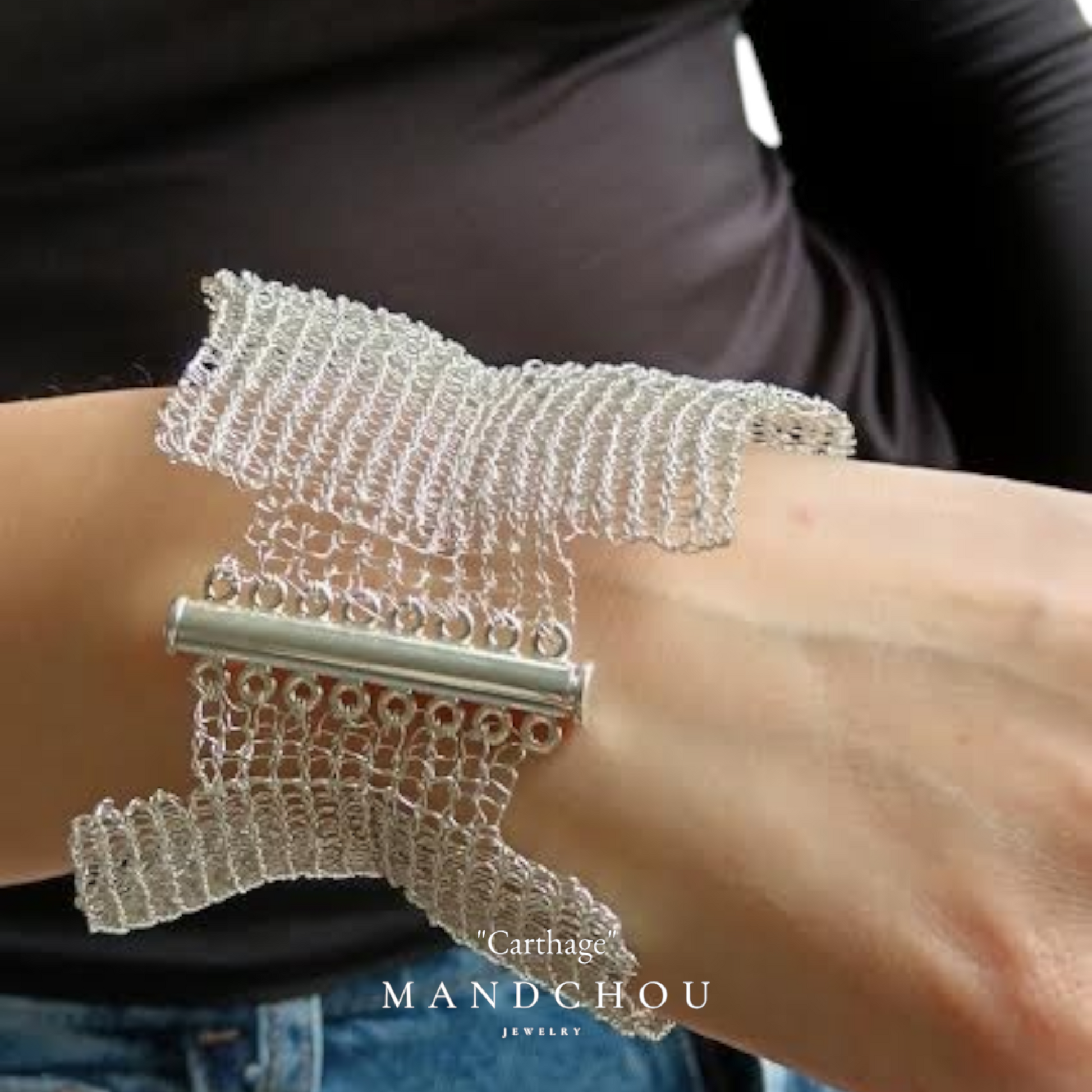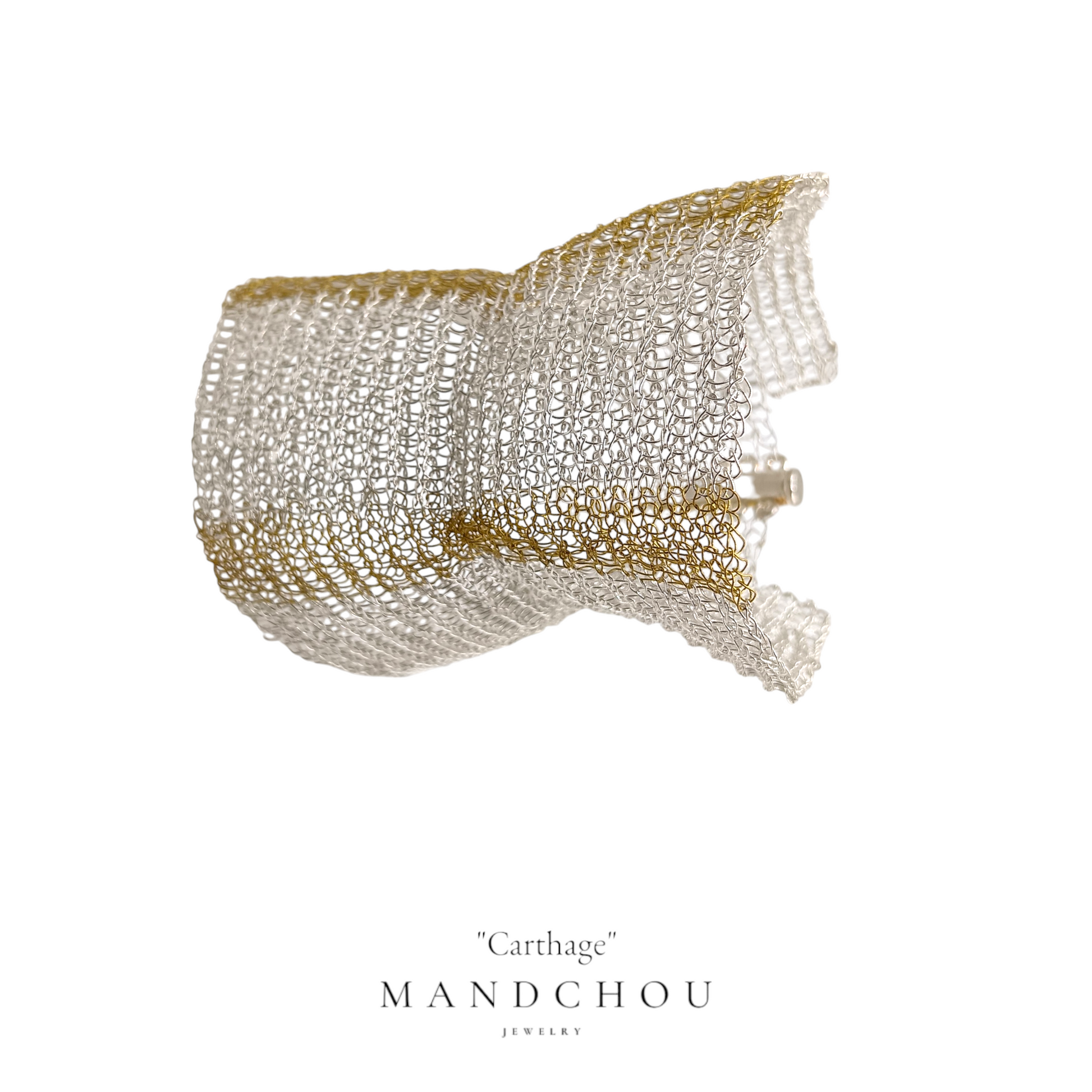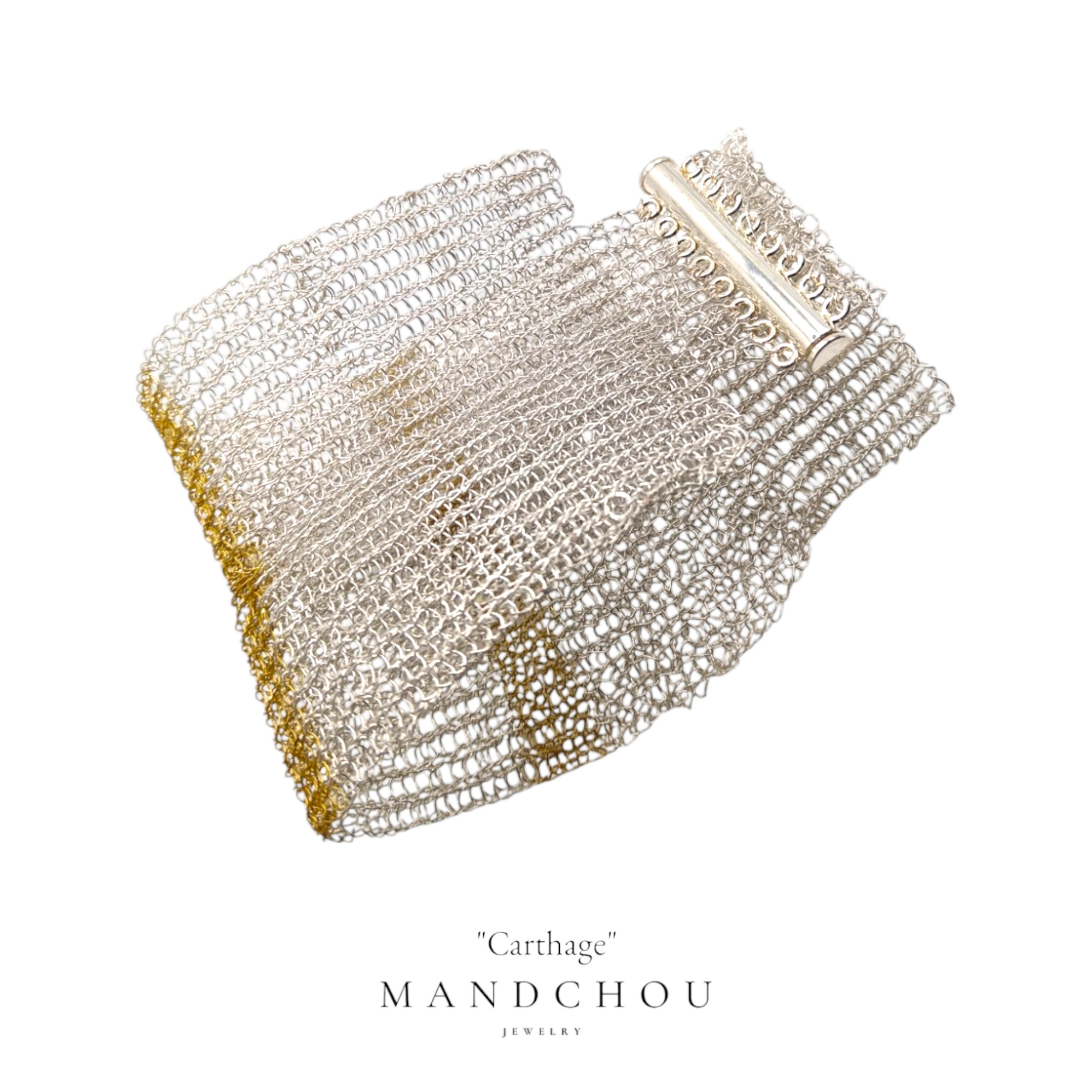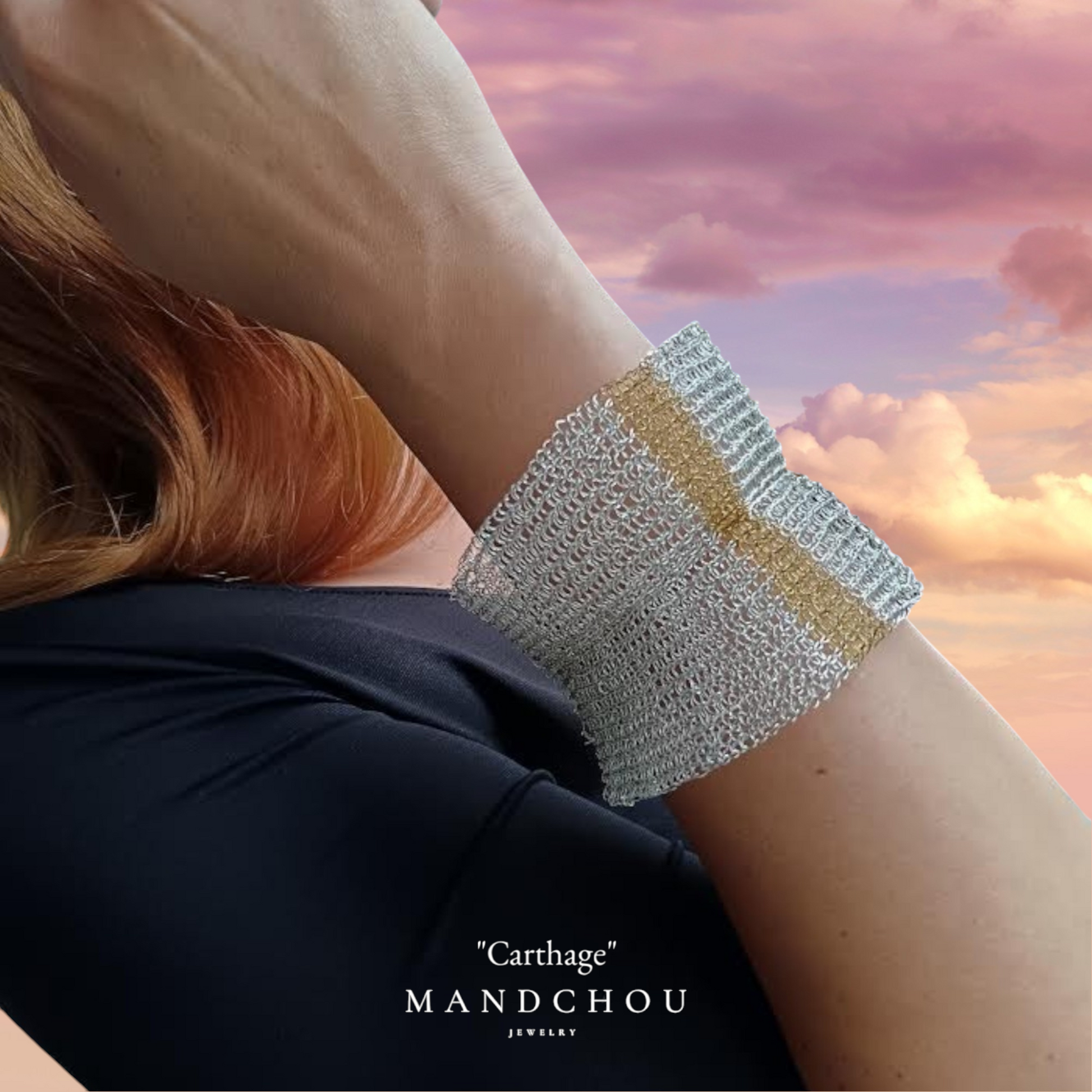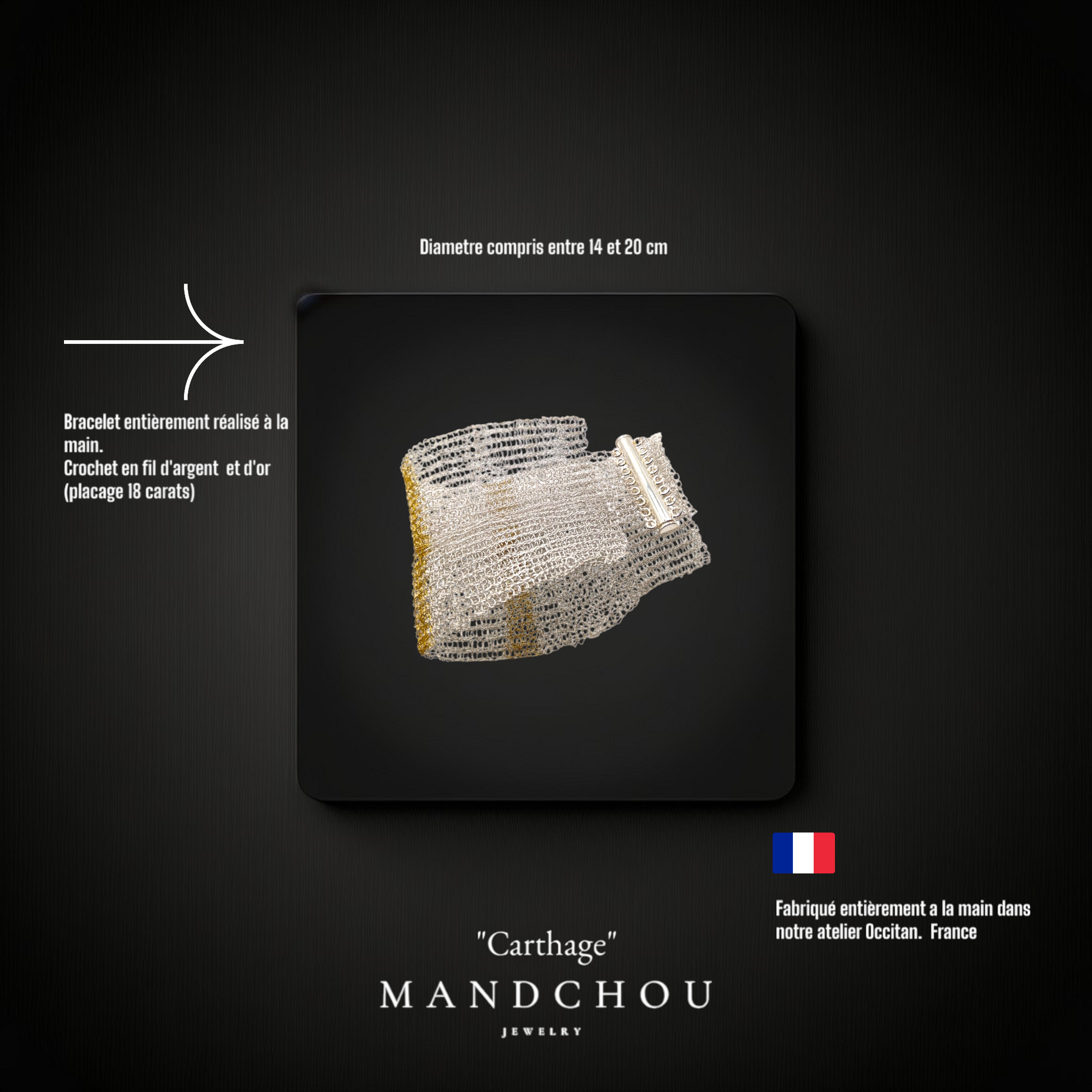 Découvrez l'élégance intemporelle de notre bracelet Carthage, une pièce maîtresse de notre collection signature "couture". Élaboré avec soin et passion, chaque bracelet est entièrement crocheté à la main dans notre atelier en Occitanie, garantissant une qualité artisanale exceptionnelle. Le bracelet Carthage arbore un somptueux mélange de couleurs bicolores or et argent, créant un contraste harmonieux qui illuminera n'importe quelle tenue.