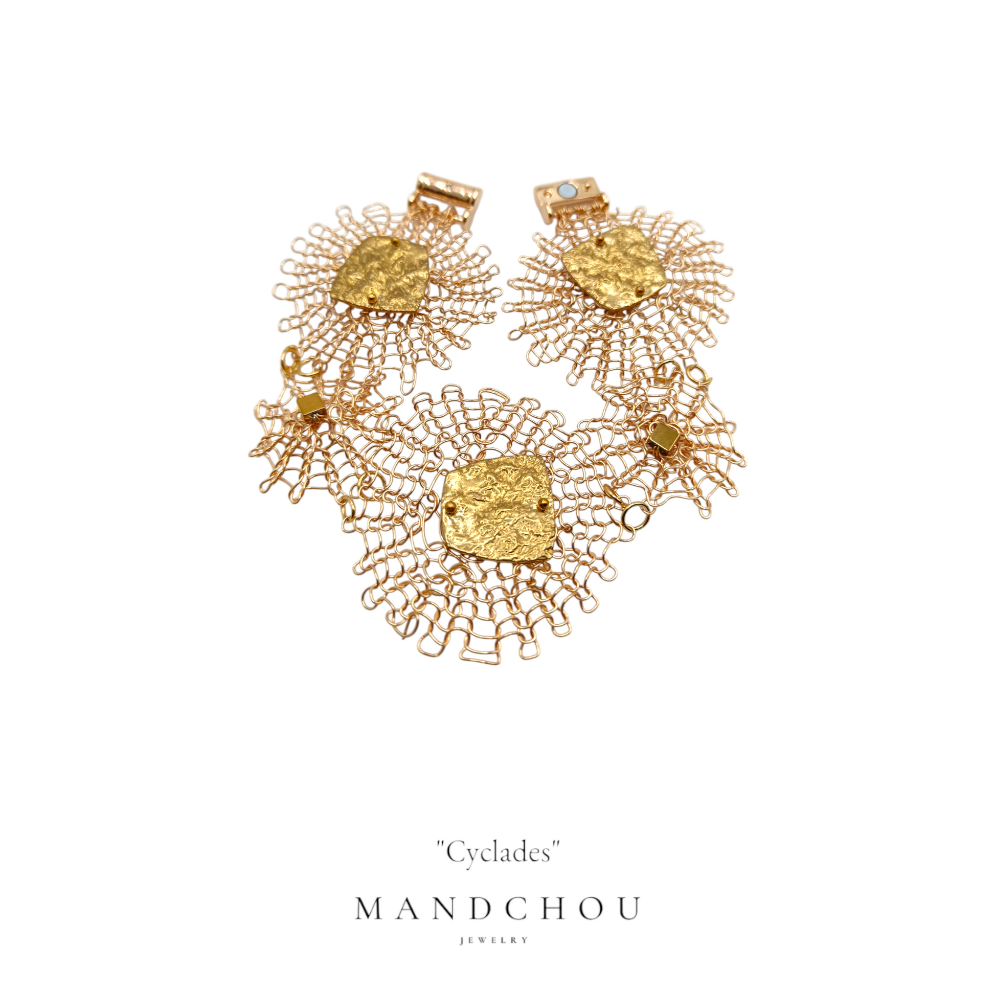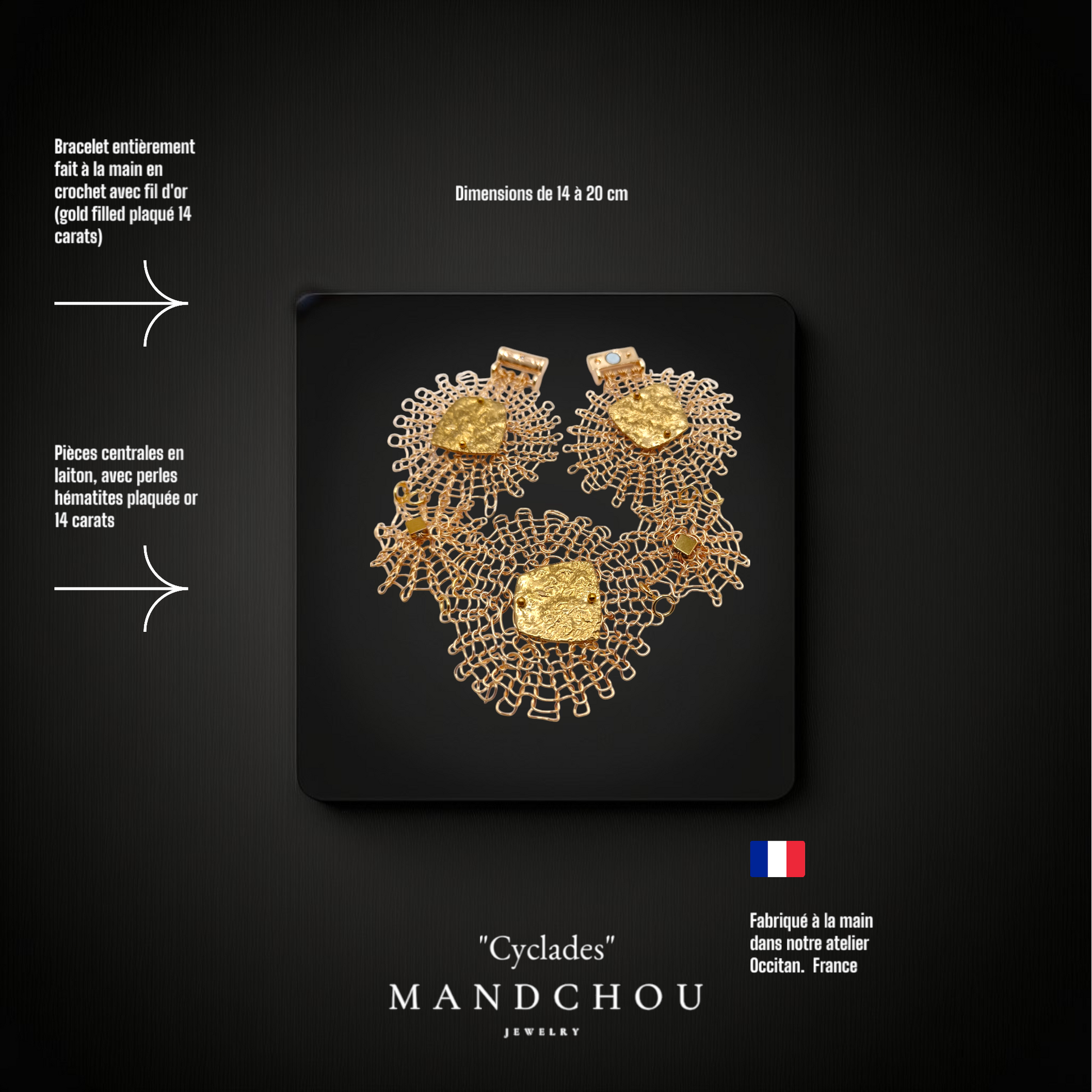 Découvrez notre bracelet "Cyclades", une pièce maîtresse de la collection signature "Couture". Confectionné avec un soin méticuleux, ce bracelet est entièrement crocheté à la main à partir de fil d'or plaqué 24 carats, offrant une élégance incomparable et un éclat qui ne manquera pas d'attirer l'attention.