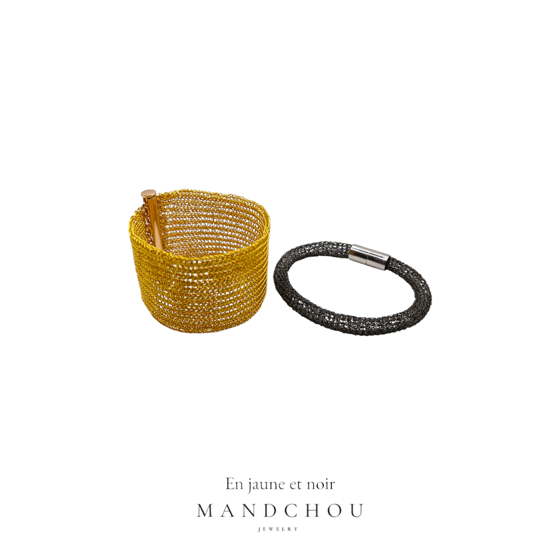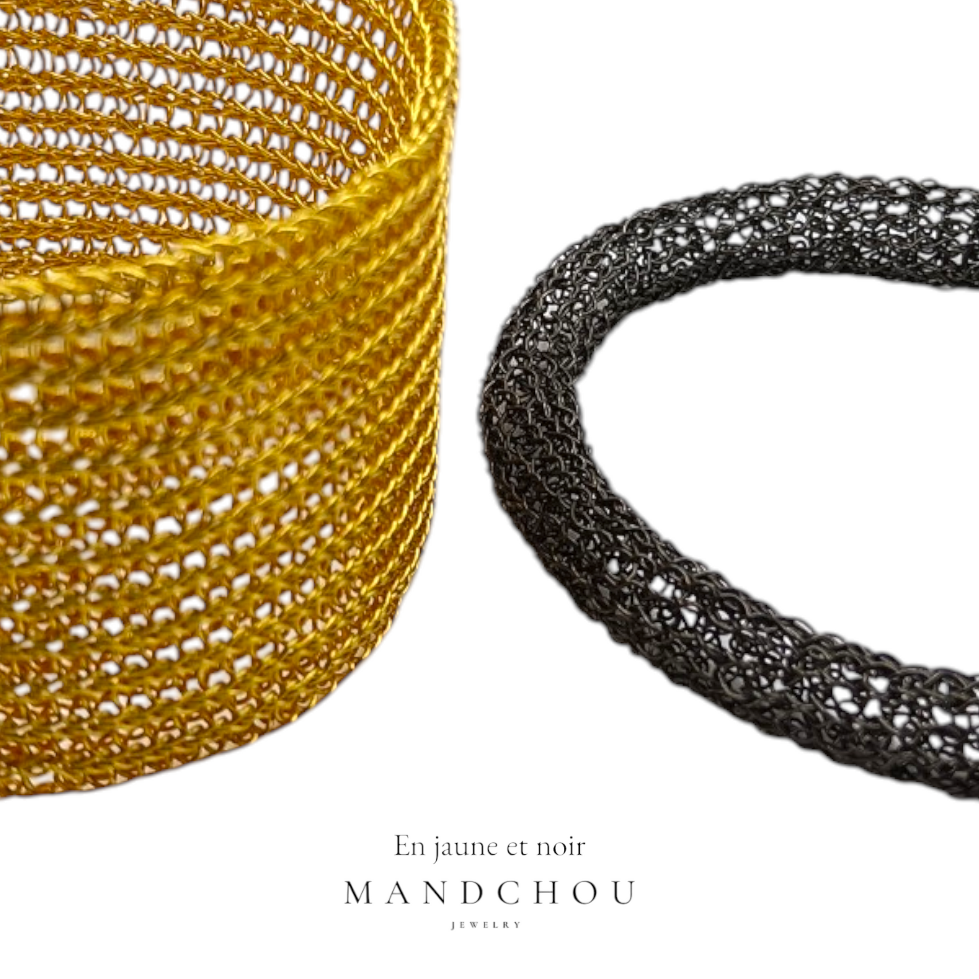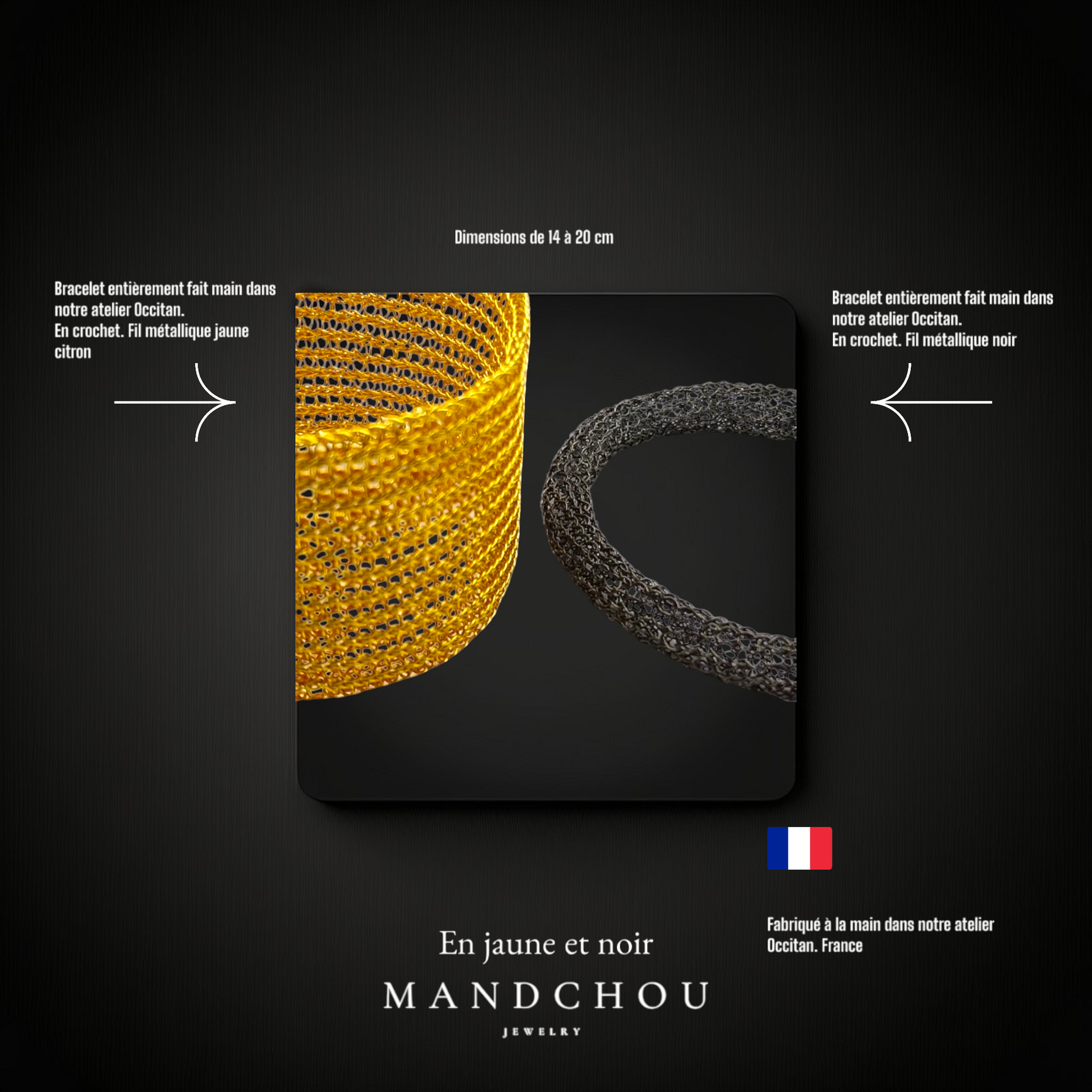 Découvrez nos bracelets "En noir et jaune", une pièce unique qui apportera une touche d'audace à votre élégance. Chaque bracelet est entièrement fabriqué à la main dans notre atelier occitan, ce qui garantit une qualité et un savoir-faire exceptionnels. Ce bijou allie avec brio un fil métallique jaune éclatant et noir profond, créant une harmonie visuelle à la fois raffinée et pétillante.