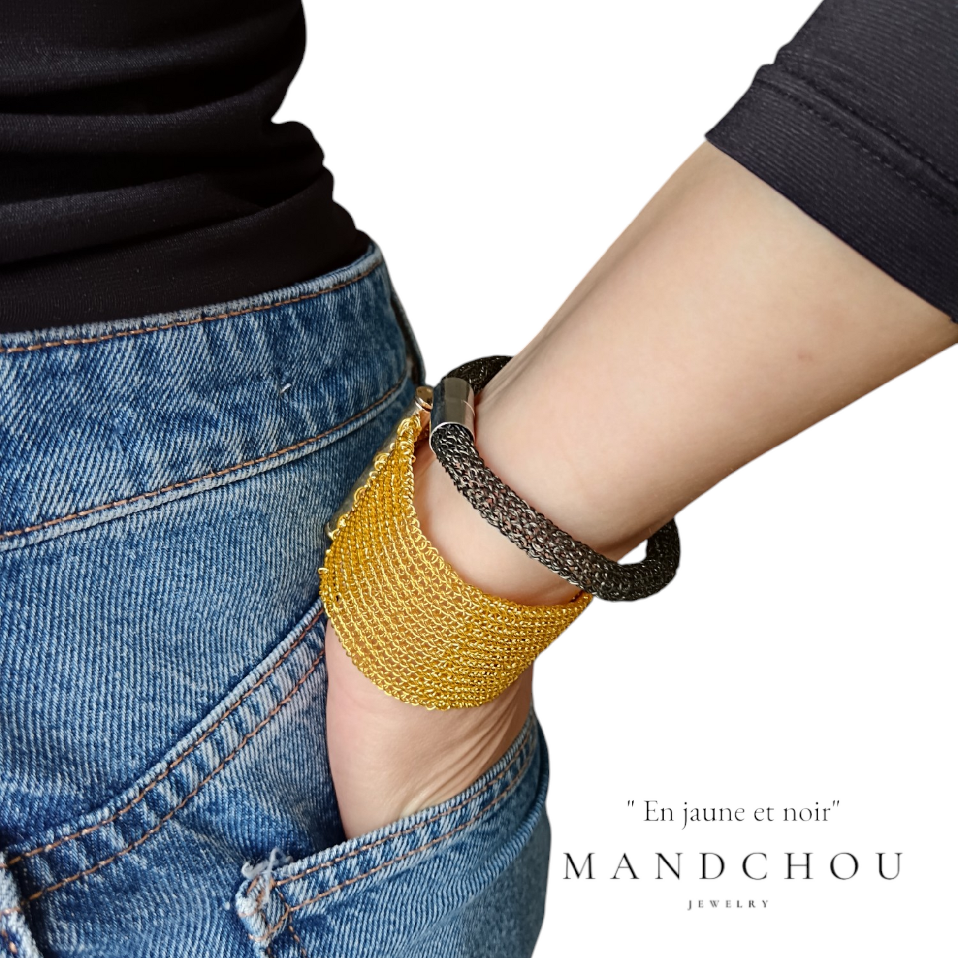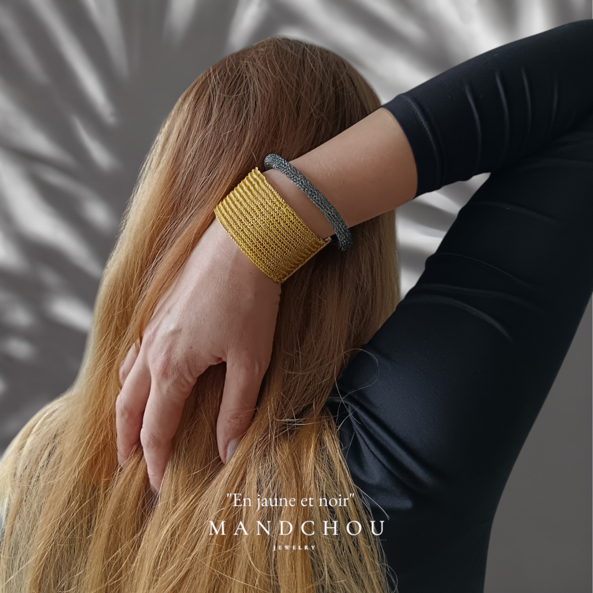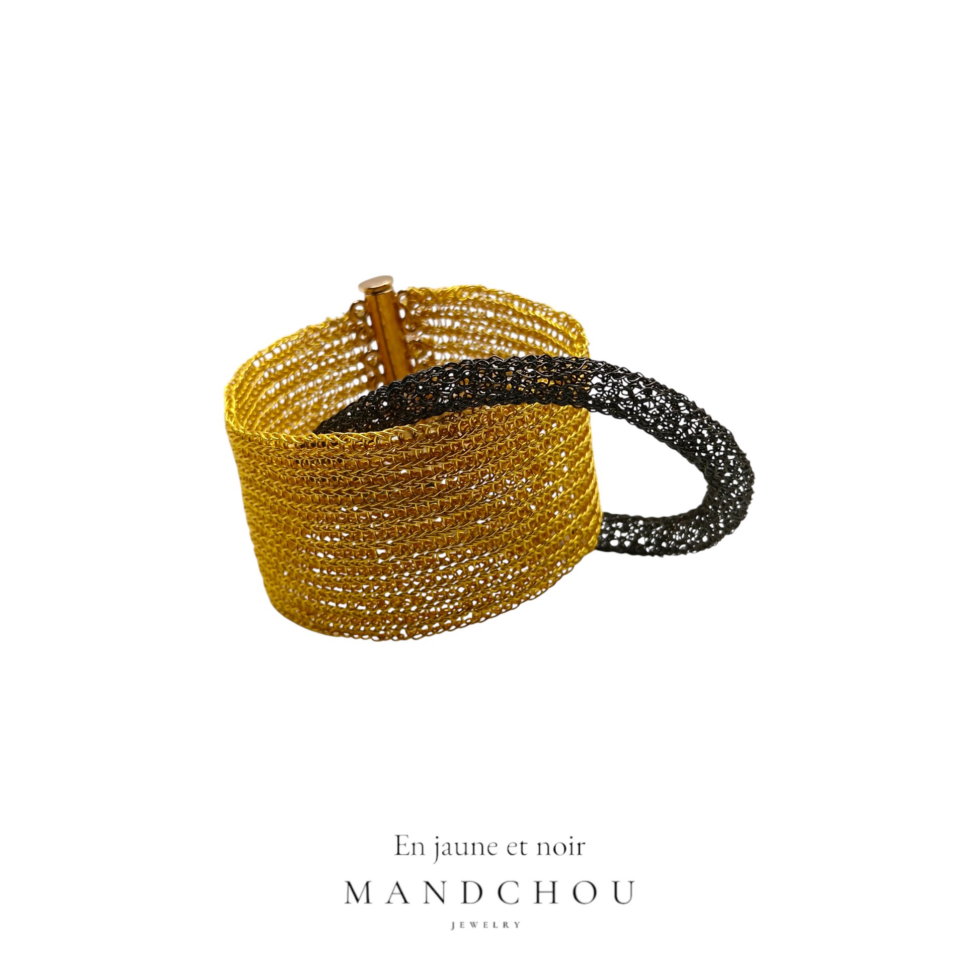 Découvrez nos bracelets "En noir et jaune", une pièce unique qui apportera une touche d'audace à votre élégance. Chaque bracelet est entièrement fabriqué à la main dans notre atelier occitan, ce qui garantit une qualité et un savoir-faire exceptionnels. Ce bijou allie avec brio un fil métallique jaune éclatant et noir profond, créant une harmonie visuelle à la fois raffinée et pétillante.